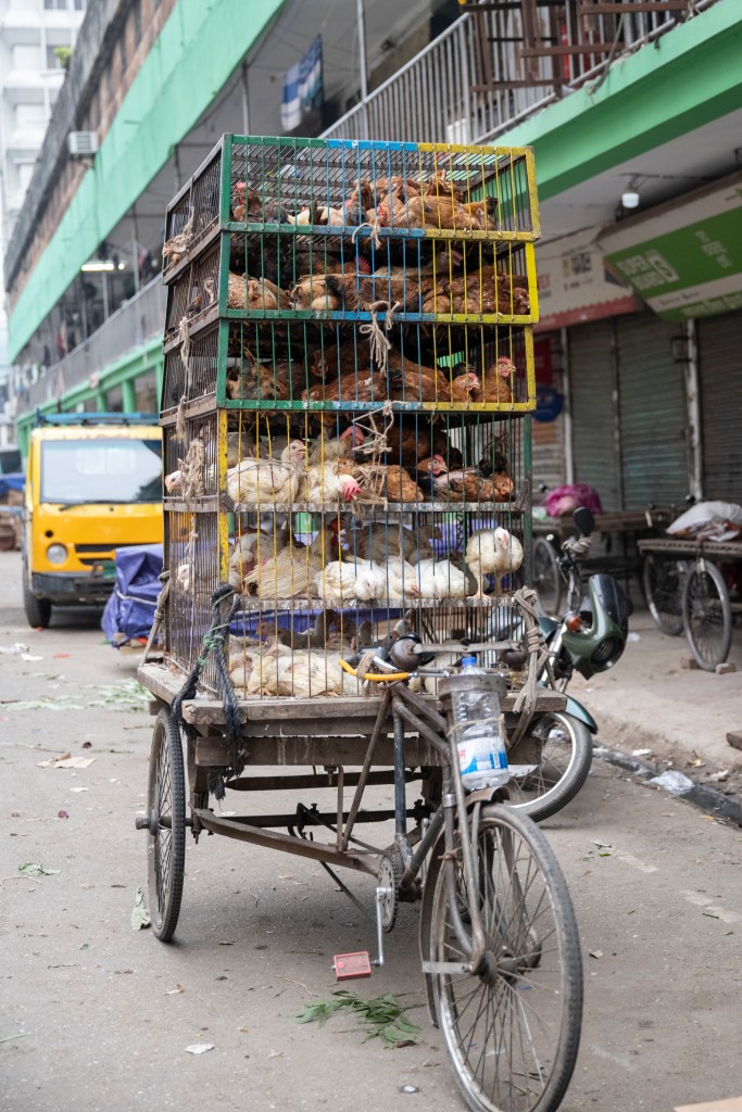 Thousands upon thousands of chickens caught our eye as we stepped into the bustling market. They have arrived by bicycle, rickshaw, and truck. A young boy standing on top of a truck, skillfully carried six chickens in each hand, holding them by their feet.