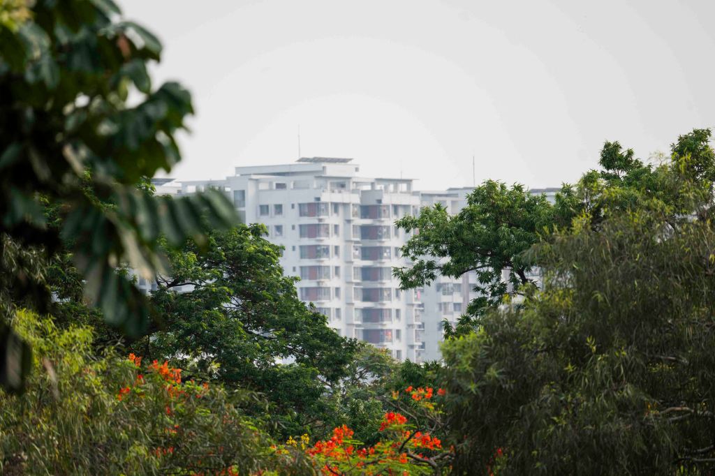 Below us in the courtyard, students milled among the trees, sharing textbooks or buying cigarettes. Some waved up at us, and Rafia waved back. A stray dog lay its head at Rafia’s feet. This, I thought, must be a bit of what it feels like to be a student at Dhaka University.