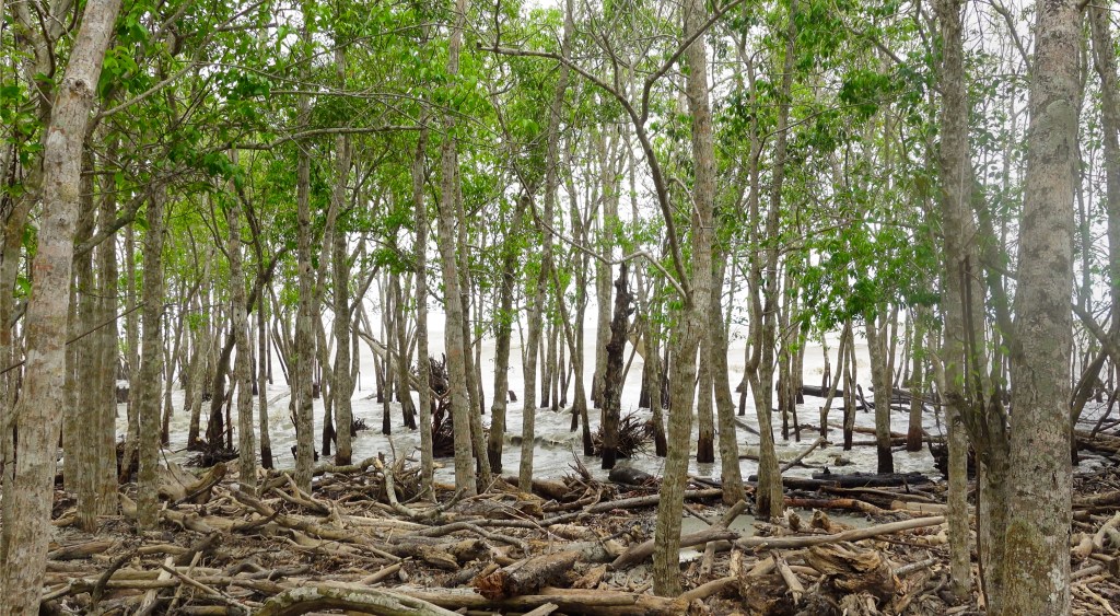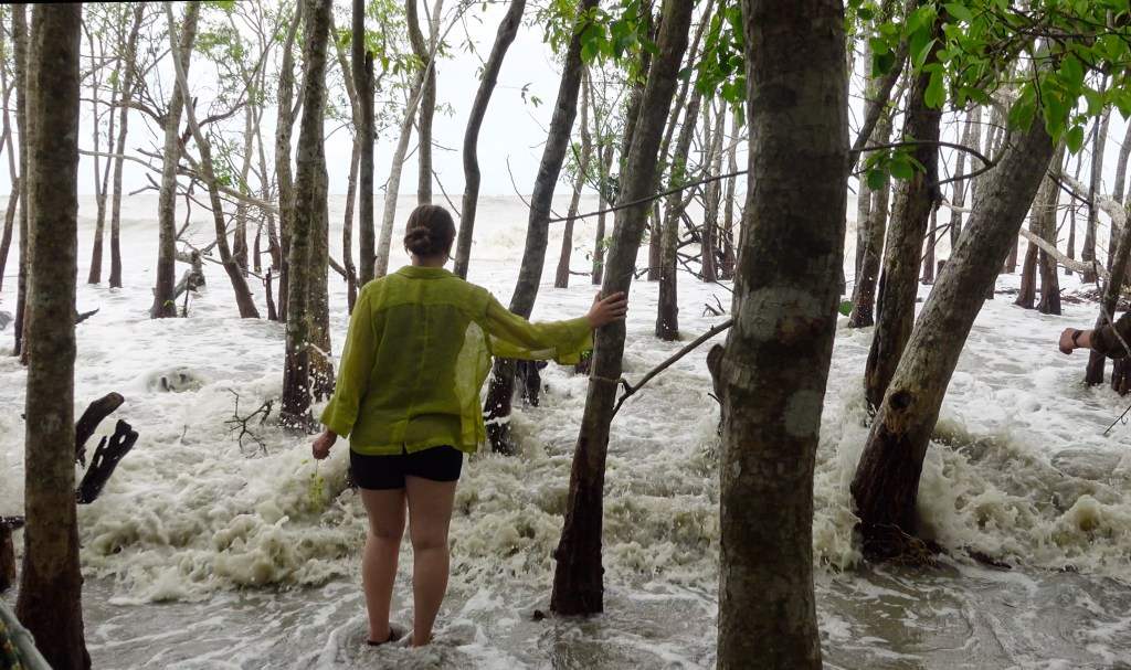 As we approached the sea, the forest floor turned into fine sand. Driftwood and Japanese net floats scattered the beach shore as white caps rippled in the distance. We quickly realized that we would not be able to swim as giant waves crashed into the shoreline due to the storm that was brewing in the Bay of Bengal.