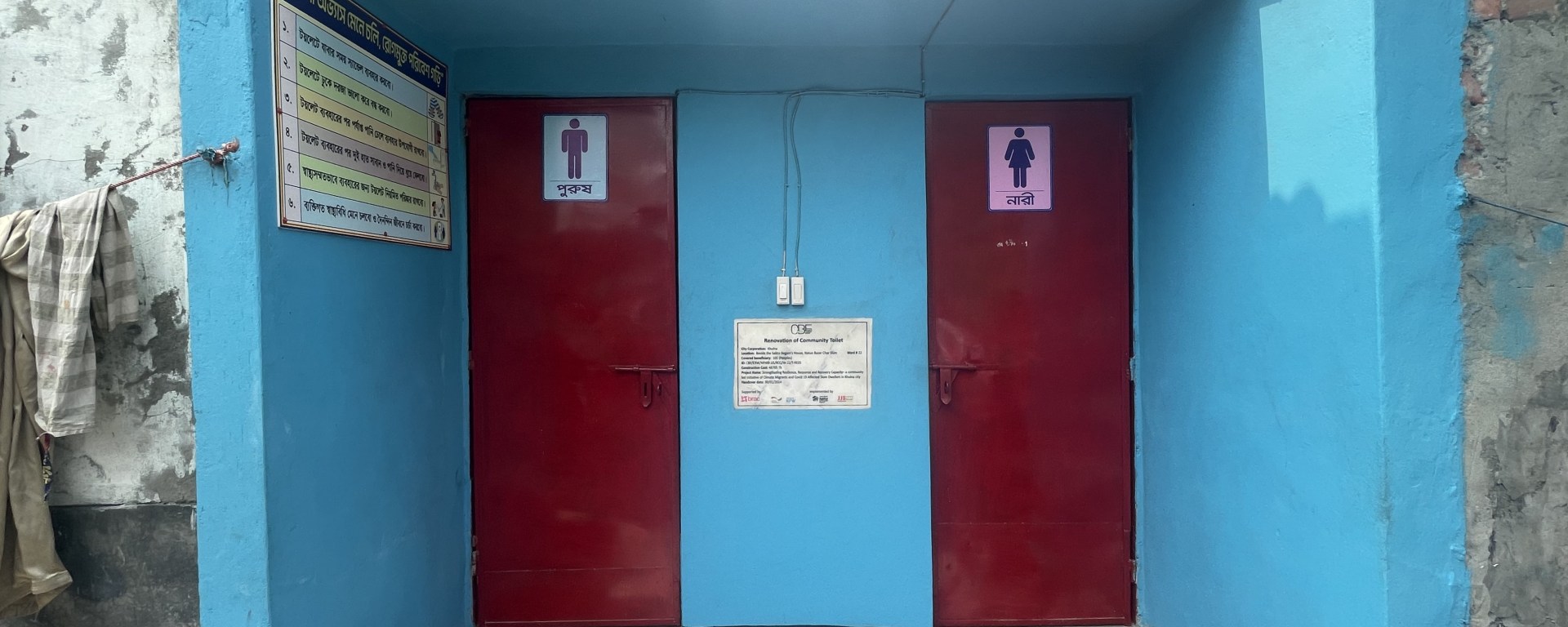 Among the narrow alleyways and wall-to-wall houses of Notun Bazar, two buildings stand out. The blue walls beam through the grayscale of southwest Bangladesh’s largest slum, and the concrete floor is invitingly smooth and unblemished. Signs proclaim both buildings newly renovated and detail the cost – about 800 U.S. dollars.