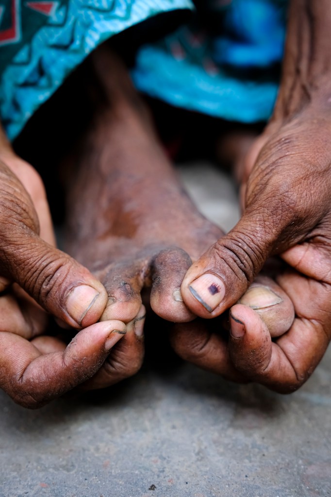 One family in the slum caught my eye in particular — a grandmother, her daughter, and her two grandchildren. I was snapping photos of the grandmother who was sewing a tarp to protect their home from the rain when her daughter came to me. I didn’t have anyone who could translate what was being said, so I just listened to her language and understood her motions like we were playing a game of charades. She undid the buttons of her son’s shirt, pointing at large patches of red skin sores on his face and stomach. There were sores on her other baby’s face as well. She was trying to tell me something about the skin issues, but our language barrier hindered the communication. Despite not knowing the words she wanted to tell me, I could see the pain in her eyes.