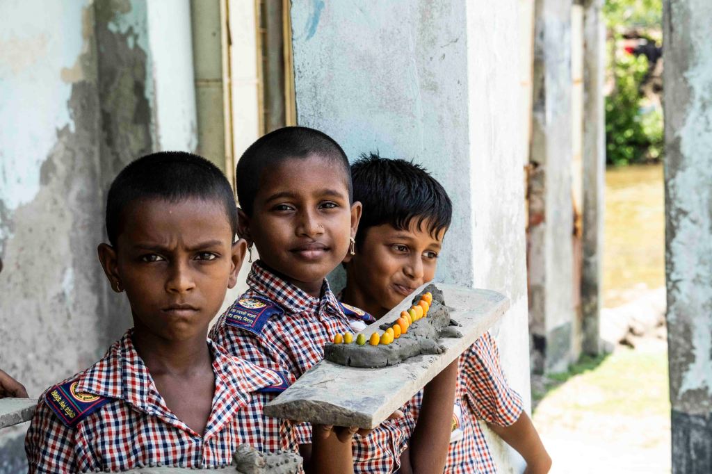 In Dhangmari, as the future artists rushed into the schoolhouse to present their clay sculptures, Mdmendei Hasom, a boy in class five, held out a crocodile, built on a slab of wood and adorned with date seeds as scales. He started to tell a story, that just a day earlier, a crocodile had swum up on shore and eaten a monkey. Hasom saw it all, he said, but he wasn’t scared.