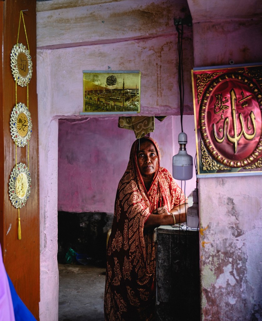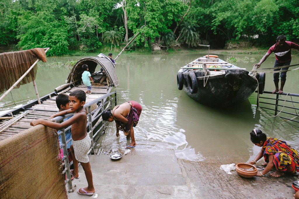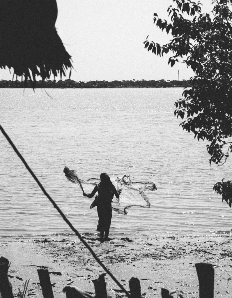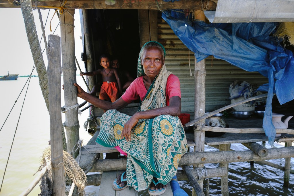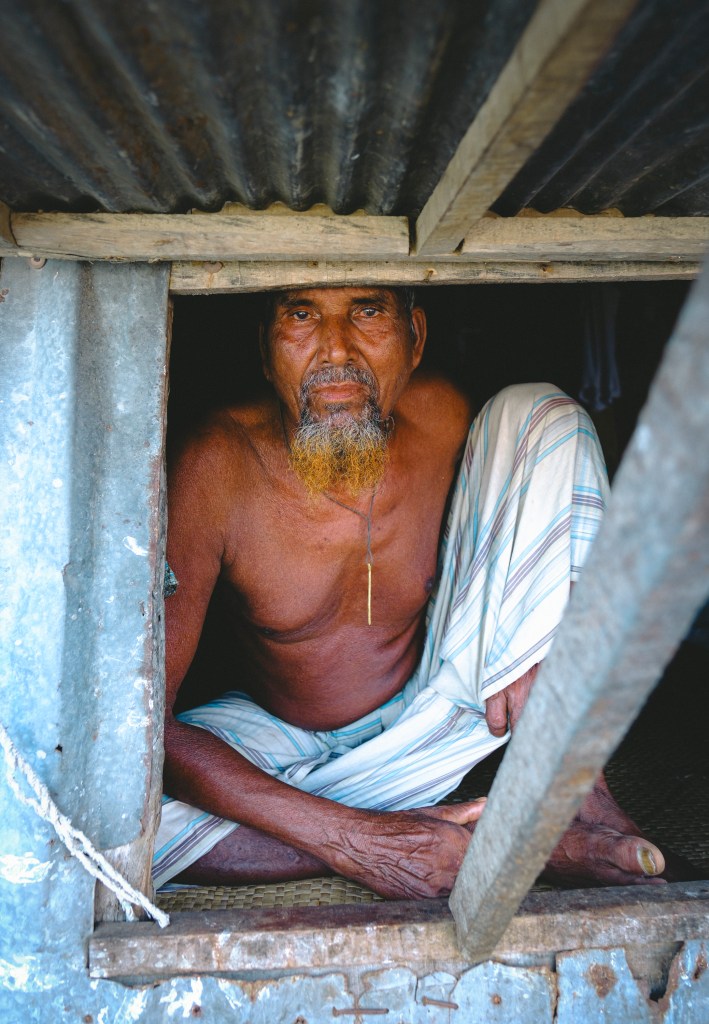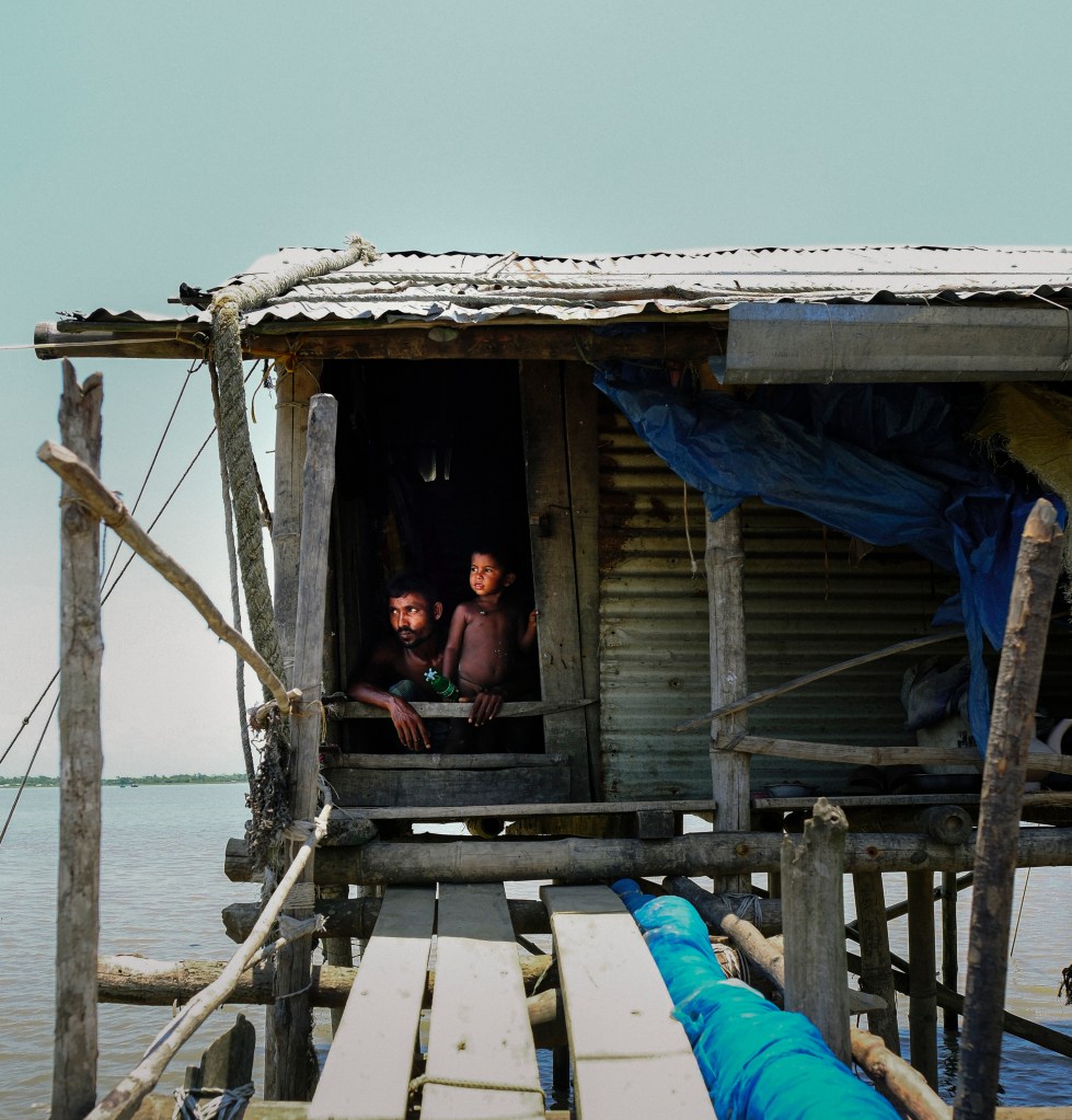 A father and his son sit inside the doorway of their stilted home, perched above the Pasur River, in Dhangmari, Bangladesh. These houses are designed for places that are prone to flooding, or surrounded by river and sea. Families typically have to rebuild their home each month, due to harsh flooding and rising tides.Momena Beguma is an 85 year old prostitute in the Dhangmari Village, in Bangladesh. Beguma makes about 50 Bangladeshi Taka a day working as a prostitute, which is equivalent to 0.43 United States Dollars. Beguma has done this work for the past 15 years, after her husband died of sickness. She lives with her son and her grandson alongside the Passer River in a stilted home, which has to be rebuilt each year due to flooding and river erosion. There is currently an estimate of 5 million people who live on sand and silt in Bangladesh, and living in this constant migration, due to Climate Change.Ankle deep in silt, a lady fishes for hours along the Pashur River, in Dhangmari, Bangladesh. Dhangmari is known for its increasingly saline water and silty shores.Members of a small fishing community prepare to begin otter fishing, in a small channel off of the Pashur River. Other members clean freshly caugh fish for their next meal.A lady watches from the doorway of a home inside the second largest slum in Bangladesh. Slums are typically unplanned residential areas, living in cement structures, housing hundreds of families. This particular slum had over 20,000 people living there.