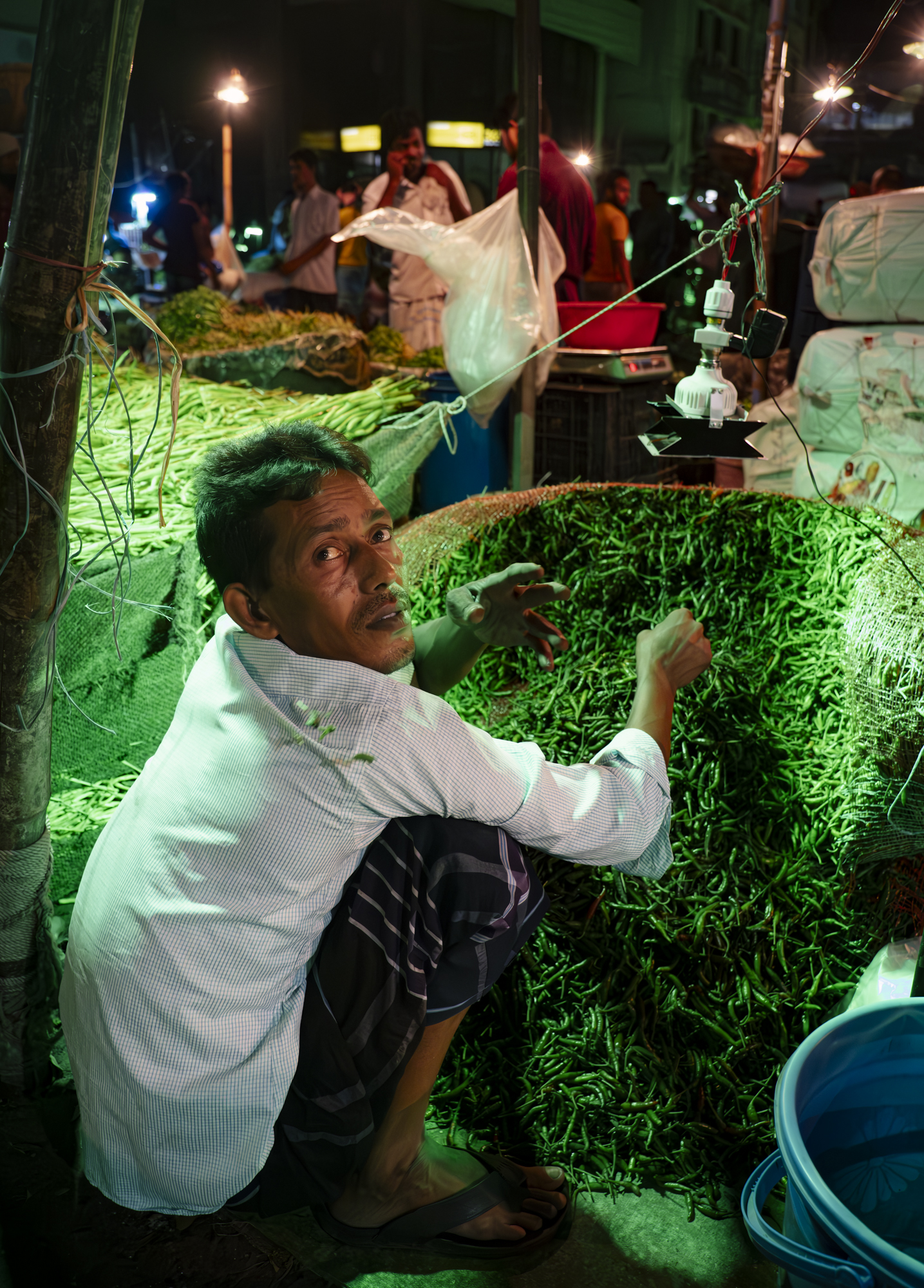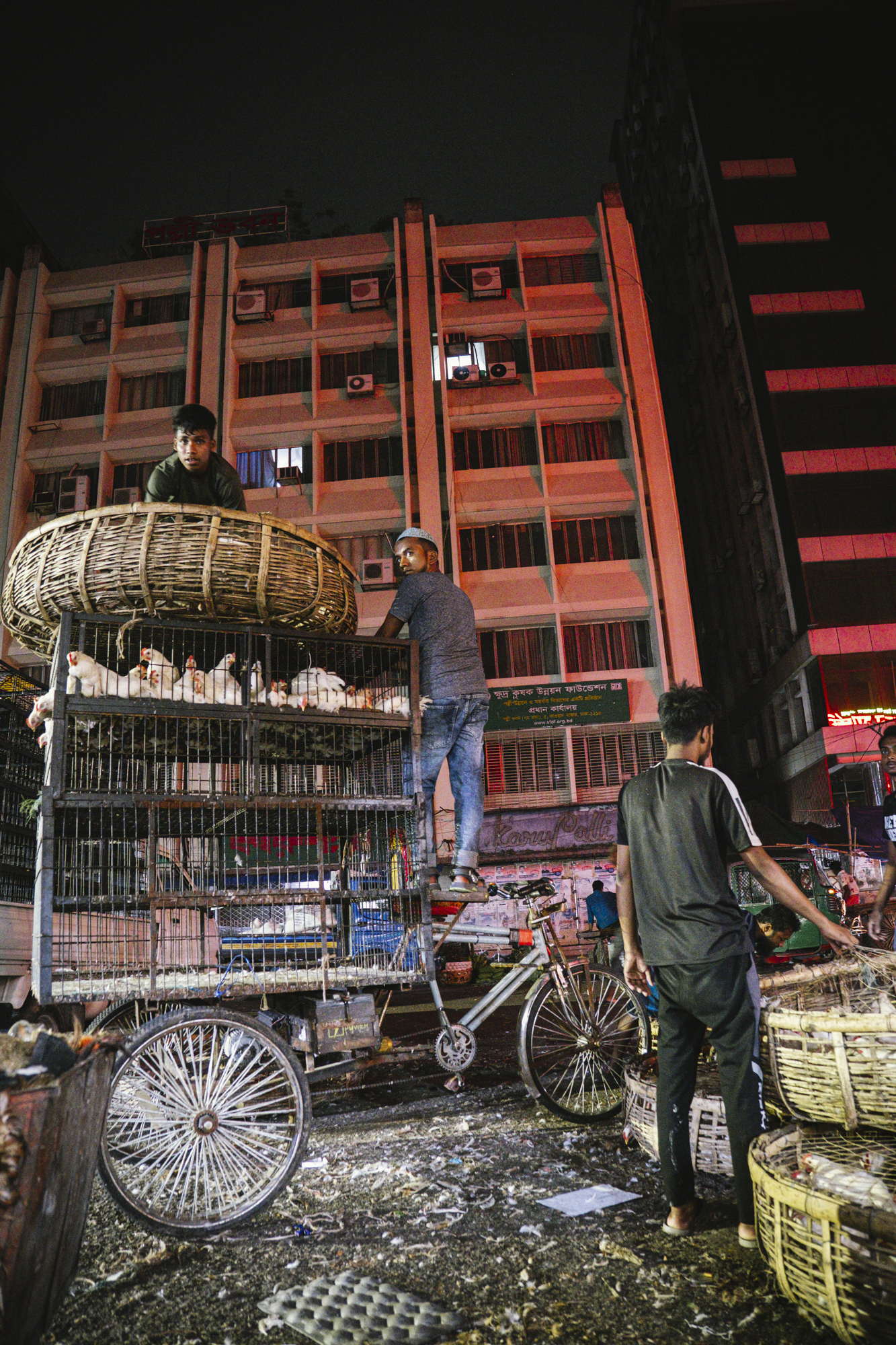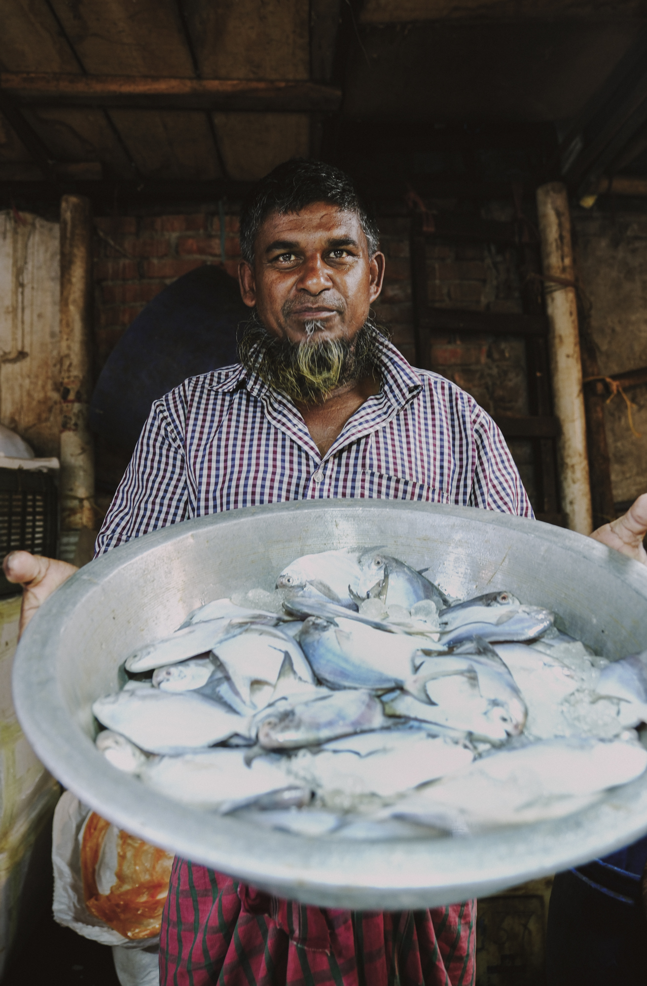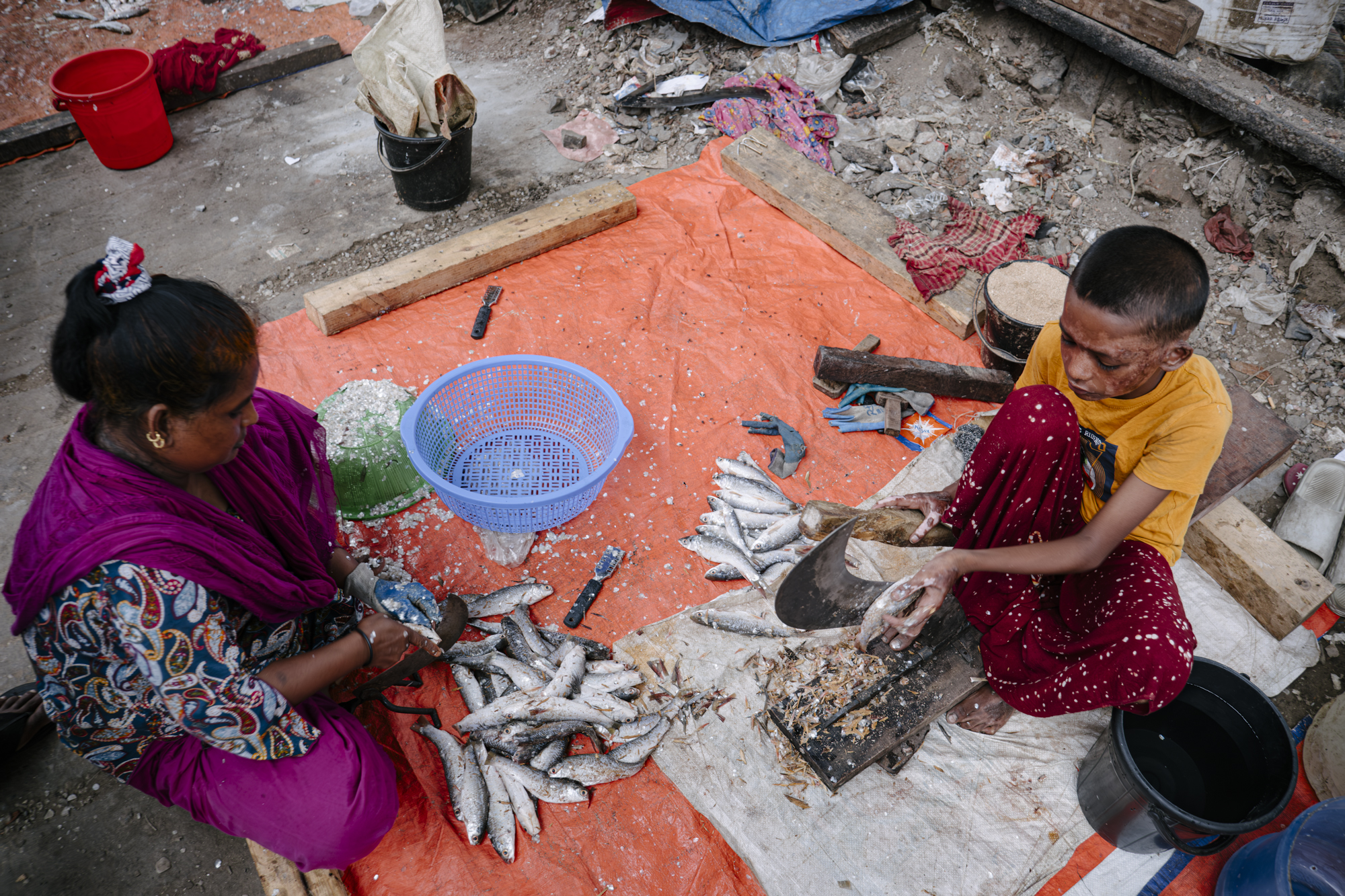A father and his son sit inside the doorway of their stilted home, perched above the Pasur River, in Dhangmari, Bangladesh. These houses are designed for places that are prone to flooding, or surrounded by river and sea. Families typically have to rebuild their home each month, due to harsh flooding and rising tides.Momena Beguma is an 85 year old prostitute in the Dhangmari Village, in Bangladesh. Beguma makes about 50 Bangladeshi Taka a day working as a prostitute, which is equivalent to 0.43 United States Dollars. Beguma has done this work for the past 15 years, after her husband died of sickness. She lives with her son and her grandson alongside the Passer River in a stilted home, which has to be rebuilt each year due to flooding and river erosion. There is currently an estimate of 5 million people who live on sand and silt in Bangladesh, and living in this constant migration, due to Climate Change.Ankle deep in silt, a lady fishes for hours along the Pashur River, in Dhangmari, Bangladesh. Dhangmari is known for its increasingly saline water and silty shores.Members of a small fishing community prepare to begin otter fishing, in a small channel off of the Pashur River. Other members clean freshly caugh fish for their next meal.A lady watches from the doorway of a home inside the second largest slum in Bangladesh. Slums are typically unplanned residential areas, living in cement structures, housing hundreds of families. This particular slum had over 20,000 people living there.